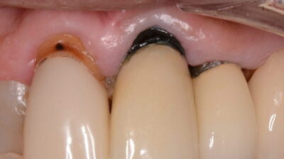 ・歯茎の厚みが薄い場合などに、着色した歯の根の色や被せ物の内面の金属が歯茎を透けて黒く見えることによるもの